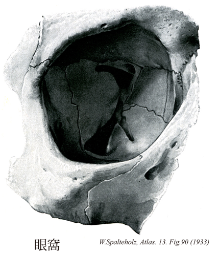 090_01【Orbit; Orbital cavity眼窩 Orbita; Cavitas orbitalis】 Orbital cavity that contains the eyeball and its appendages. →(眼窩は眼球とその付属器とを容れる不規則な四角錐体状の大きなくぼみで、最深部はその後内方にある。錐体底にあたる部はほぼ四辺形の眼窩口で、軽度外下方に傾いており、顔面に開いている。その上縁を眼窩上縁、下縁を眼窩下縁という。眼窩上縁は前頭鱗からなり、その内側半分に2個の切痕または孔があり、その内側のものを前頭切痕(まれに前頭孔)、外側のものを眼窩上孔(まれに眼窩上切痕)とう。眼窩下縁は上顎骨体および頬骨からなり、その下方に眼窩下孔が開口している。眼窩は上・下・内側・外側の4壁を有し、7種類の骨による10部より形成されている。上壁は大部分が前頭骨眼窩面および蝶形骨小翼腹側面よりなり、外側には涙腺窩、小翼内には視神経管があり、ここに視神経および眼動脈を通す。下壁は大部分が上顎骨眼窩面によりなるが、外側の一部が頬骨眼窩面、後方の小部分が口蓋骨眼窩突起により形成されている。また後方から前方へ眼窩下溝その延長部である眼窩下管が走り、これが既述の眼窩下孔に開口する。内側壁は大部分が篩骨眼窩板により形成され、残りの部分のうちの前部は上顎骨前突起および涙骨、後部は蝶形骨体側面最前部によって形成されている。なお篩骨眼窩板上縁と前頭骨眼窩部との間には、前篩骨孔および後篩骨孔があり、前者は鼻腔に行く前篩骨神経および前篩骨動脈を通し、後者は篩骨蜂巣に行く後篩骨神経および後篩骨動脈を通す。また内側壁の前部にある涙嚢窩は、上顎骨の前涙嚢稜と涙骨の孔涙嚢稜との間にあり、稜骨の涙嚢溝が合して形成されたものである。外側壁は前半部は頬骨眼窩面、後半部は蝶形骨大翼眼窩面と上壁の蝶形骨小翼との間には頭蓋腔に通ずる上眼窩裂があり、動眼神経、滑車神経、眼神経、外転神経、上眼静脈などを通す。また外側壁後半部の蝶形骨大翼眼窩面と下壁の上顎骨眼窩面との間には翼口蓋窩および側頭下窩に通ずる下眼窩裂があり、眼窩下神経、頬骨神経、下眼静脈などを通す。)