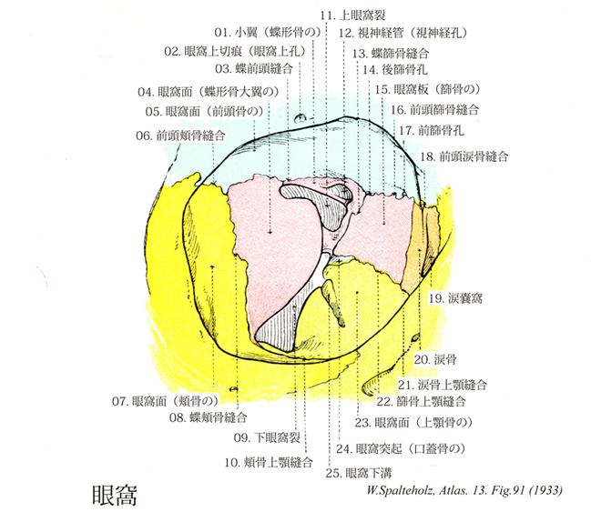 →(眼窩は眼球とその付属器とを容れる不規則な四角錐体状の大きなくぼみで、最深部はその後内方にある。錐体底にあたる部はほぼ四辺形の眼窩口で、軽度外下方に傾いており、顔面に開いている。その上縁を眼窩上縁、下縁を眼窩下縁という。眼窩上縁は前頭鱗からなり、その内側半分に2個の切痕または孔があり、その内側のものを前頭切痕(まれに前頭孔)、外側のものを眼窩上孔(まれに眼窩上切痕)とう。眼窩下縁は上顎骨体および頬骨からなり、その下方に眼窩下孔が開口している。眼窩は上・下・内側・外側の4壁を有し、7種類の骨による10部より形成されている。上壁は大部分が前頭骨眼窩面および蝶形骨小翼腹側面よりなり、外側には涙腺窩、小翼内には視神経管があり、ここに視神経および眼動脈を通す。下壁は大部分が上顎骨眼窩面によりなるが、外側の一部が頬骨眼窩面、後方の小部分が口蓋骨眼窩突起により形成されている。また後方から前方へ眼窩下溝その延長部である眼窩下管が走り、これが既述の眼窩下孔に開口する。内側壁は大部分が篩骨眼窩板により形成され、残りの部分のうちの前部は上顎骨前突起および涙骨、後部は蝶形骨体側面最前部によって形成されている。なお篩骨眼窩板上縁と前頭骨眼窩部との間には、前篩骨孔および後篩骨孔があり、前者は鼻腔に行く前篩骨神経および前篩骨動脈を通し、後者は篩骨蜂巣に行く後篩骨神経および後篩骨動脈を通す。また内側壁の前部にある涙嚢窩は、上顎骨の前涙嚢稜と涙骨の孔涙嚢稜との間にあり、稜骨の涙嚢溝が合して形成されたものである。外側壁は前半部は頬骨眼窩面、後半部は蝶形骨大翼眼窩面と上壁の蝶形骨小翼との間には頭蓋腔に通ずる上眼窩裂があり、動眼神経、滑車神経、眼神経、外転神経、上眼静脈などを通す。また外側壁後半部の蝶形骨大翼眼窩面と下壁の上顎骨眼窩面との間には翼口蓋窩および側頭下窩に通ずる下眼窩裂があり、眼窩下神経、頬骨神経、下眼静脈などを通す。)