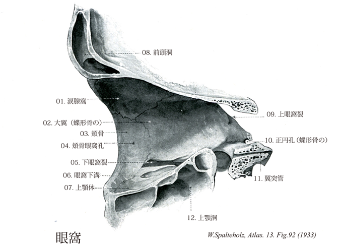 →(眼窩は眼球とその付属器とを容れる不規則な四角錐体状の大きなくぼみで、最深部はその後内方にある。錐体底にあたる部はほぼ四辺形の眼窩口で、軽度外下方に傾いており、顔面に開いている。その上縁を眼窩上縁、下縁を眼窩下縁という。眼窩上縁は前頭鱗からなり、その内側半分に2個の切痕または孔があり、その内側のものを前頭切痕(まれに前頭孔)、外側のものを眼窩上孔(まれに眼窩上切痕)とう。眼窩下縁は上顎骨体および頬骨からなり、その下方に眼窩下孔が開口している。眼窩は上・下・内側・外側の4壁を有し、7種類の骨による10部より形成されている。上壁は大部分が前頭骨眼窩面および蝶形骨小翼腹側面よりなり、外側には涙腺窩、小翼内には視神経管があり、ここに視神経および眼動脈を通す。下壁は大部分が上顎骨眼窩面によりなるが、外側の一部が頬骨眼窩面、後方の小部分が口蓋骨眼窩突起により形成されている。また後方から前方へ眼窩下溝その延長部である眼窩下管が走り、これが既述の眼窩下孔に開口する。内側壁は大部分が篩骨眼窩板により形成され、残りの部分のうちの前部は上顎骨前突起および涙骨、後部は蝶形骨体側面最前部によって形成されている。なお篩骨眼窩板上縁と前頭骨眼窩部との間には、前篩骨孔および後篩骨孔があり、前者は鼻腔に行く前篩骨神経および前篩骨動脈を通し、後者は篩骨蜂巣に行く後篩骨神経および後篩骨動脈を通す。また内側壁の前部にある涙嚢窩は、上顎骨の前涙嚢稜と涙骨の孔涙嚢稜との間にあり、稜骨の涙嚢溝が合して形成されたものである。外側壁は前半部は頬骨眼窩面、後半部は蝶形骨大翼眼窩面と上壁の蝶形骨小翼との間には頭蓋腔に通ずる上眼窩裂があり、動眼神経、滑車神経、眼神経、外転神経、上眼静脈などを通す。また外側壁後半部の蝶形骨大翼眼窩面と下壁の上顎骨眼窩面との間には翼口蓋窩および側頭下窩に通ずる下眼窩裂があり、眼窩下神経、頬骨神経、下眼静脈などを通す。)