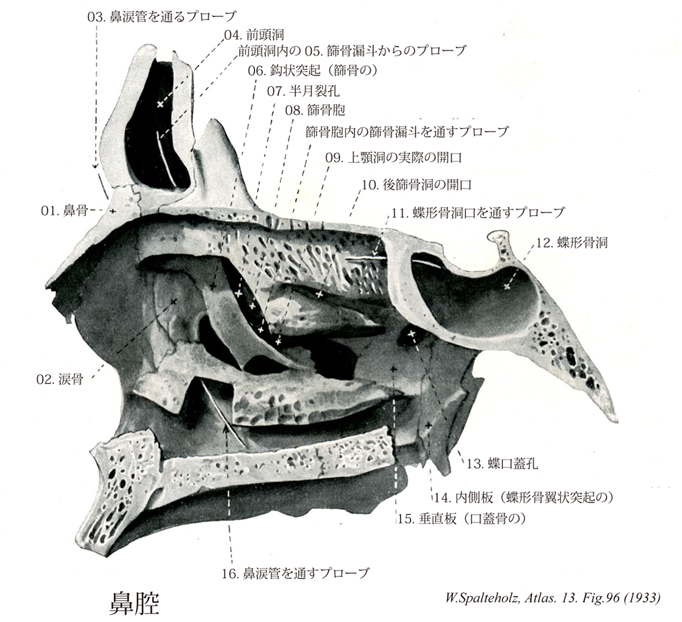 →(鼻腔は気道の起始部であり、内壁は鼻粘膜によっておおわれ、鼻中隔によって二分される。外界への開口部は外鼻孔とよばれ、後方は後鼻孔をもって咽頭鼻部につづく。鼻腔は鼻前庭と狭義の鼻腔とに分けることができる。鼻前庭は鼻翼の形に拡張し、粘膜は皮膚からつづく重層扁平上皮で剛毛(鼻毛)を有する。鼻前庭の降誕は鼻限とよばれる弓状の隆起を示し、固有鼻腔に移行する。鼻中隔は篩骨垂直板と鋤骨よりなる尾骨および鼻中隔軟骨よりなる軟骨部がその大部分を占め、その前部の左右の外鼻孔の間は軟組織からなり、篩骨篩板と鋤骨の間にはさまる。鼻中隔軟骨の前下部には鋤鼻軟骨中に嗅覚器の名ごり(鋤鼻器)の盲孔がみられることがある。鋤鼻器は両性類、爬虫類では嗅覚器として機能し、哺乳類の中では単孔類、有袋類、食虫類、齧歯類でよく発達している。人では胎生期前半にはよく発達するが、次第に萎縮し痕跡器官となる。鼻中隔軟骨下縁の前側にはよく発達するが、次第に萎縮痕跡器官となる。微衷飼う軟骨下縁の前側に、盲端に終わる切歯管が勧誘している。鼻腔の外側壁より上・中・下鼻甲介が突出し、それぞれの下に上・中・下鼻道をつくる。下鼻甲介の基部で中鼻道の前方は中鼻道前房とよばれる弓状の隆起で、中鼻甲介の基部に移行する。また、中鼻道には篩骨蜂巣の一部が膨らみでて篩骨胞をなし、その全科法の篩骨突起との間に半月裂孔をはさむ。半月裂孔は副鼻腔の一つである上顎洞に向かって深く入り篩骨漏斗となる。上鼻道の後上方にはときに最上鼻甲介とよばれる小さな突起があり、その後上方の鼻腔上壁は篩骨迷路の内側壁と蝶形骨体前面で裂かされるへこみで蝶篩陥凹という。上・中・下鼻道は鼻腔後部で狭い鼻咽道に集合し、後鼻孔を通じて後頭鼻部につづく。鼻粘膜の大部分は多裂腺毛円柱上皮性の呼吸部で、混合性の鼻尖と杯細胞を有する。粘膜固有層にはしばしばリンパ小節をみる。呼吸部のうち鼻中隔と鼻甲介の粘膜は上皮下の静脈網がきわめてよく発達しているため肥厚し、鼻甲介海面層とよばれる。鼻腔甲状壁の上鼻道から上と鼻中隔のこれに対する面は分散する鼻粘膜の球部が位置する。中鼻甲介の根部と嗅部粘膜上皮の構成にあずかっている。嗅上皮下には漿液性の休戦がある。嗅部の体積は両側の鼻腔を合わせて約500mm2といわれ、かれいとともに縮小する傾向がある。 (解剖学事典 朝倉書店より引用))
