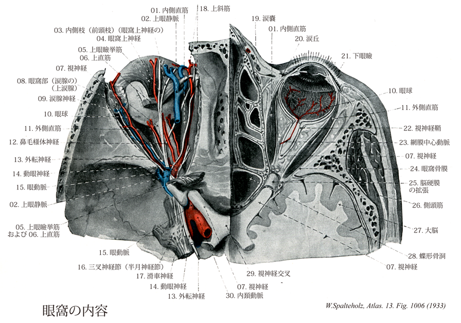 →(眼窩の壁をつくる骨を被う骨膜は眼窩骨膜といわれ、骨との結合はゆるく、頭蓋下面の骨膜につづく。また上顎窩裂や視神経管では頭蓋腔の脳硬膜に連なる。)