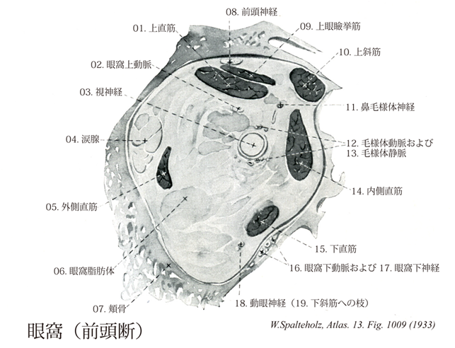 →(眼球は眼窩のなかで眼筋・血管・神経などとともに脂肪組織内に埋まっている。この脂肪組織を眼窩脂肪体という。)
