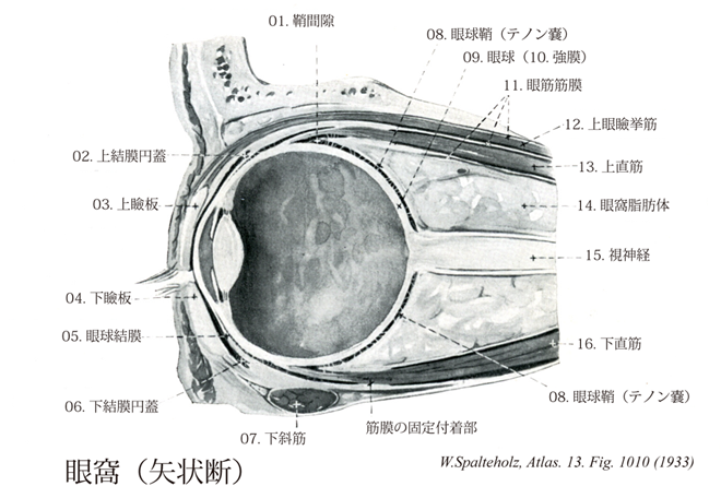 - 1010_08Tenon's capsule【Fascial sheath of eyeball眼球鞘;テノン嚢 Vagina bulbi; Capsula bulbi】 Connective-tissue sheath between the eyeball and orbital fat. It is attached posteriorly at the optic nerve to the sclera. It ends anteriorly below the conjunctiva. It is separated from the sclera mostly by the episcleral space.