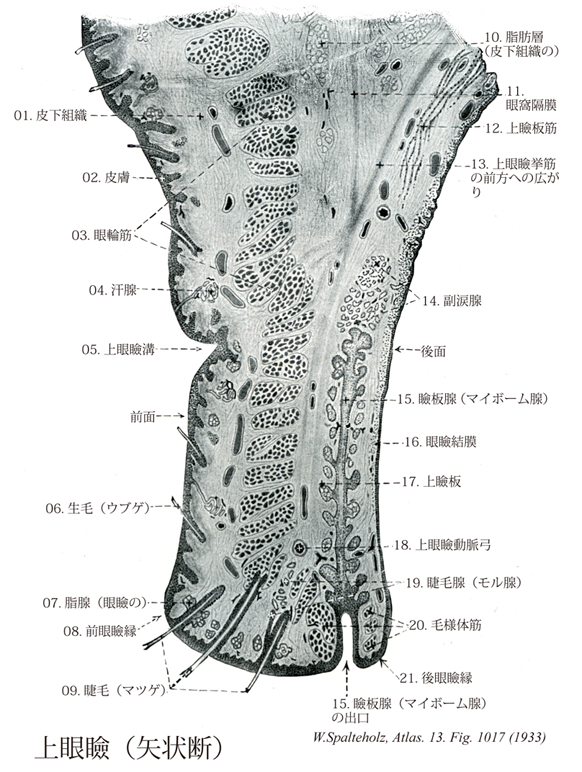 →(上瞼板は高さ約10mmあり、皿状に曲がっている。かたい縺れた膠原線維性の結合組織よりなる。瞼板腺を含む。上眼瞼を広く反転できるのは、ここに上眼板があるからである。とくに日本人では、眼輪筋と瞼板との間に疎性結合組織と脂肪組織があって内輪筋と瞼板とはゆるく結合するので、眼瞼を反転しやすい。上瞼板と皮膚との結合が粗であると一重瞼であるが、結合が密でつよいと二重瞼となる。)