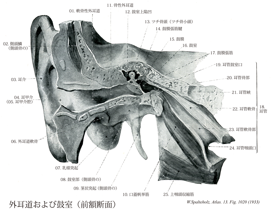 →(S字状ににまがり、一部は軟骨性、一部は骨性である。長さ約2.4cm、直径約6mmである。 (Feneis) 外耳道は側頭骨の鼓室部を耳介から鼓膜へ至る通路で骨性部分。軟骨性外耳道からなる。)
