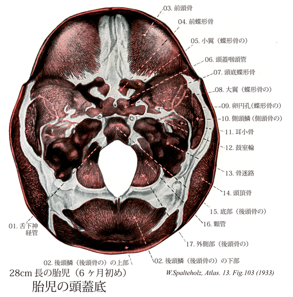 →(後頭骨の底部は大後頭孔前縁の前方にある長方形の板状部で、内頭蓋底と外頭蓋底の斜台の下半分を作る。両側縁は側頭骨の錐体と軟骨結合している。)