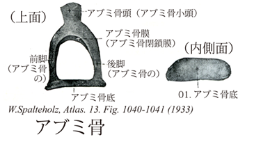 1041_01【Base of stapes; Footplateアブミ骨底 Basis stapedis】 Part inserted in the oval window. →(アブミ骨底は楕円形の扁平な板状で、鼓室の内側壁にある前庭窓にはまりこんでいる。底と前庭窓とはアブミ骨輪状靱帯で結ばれている。)