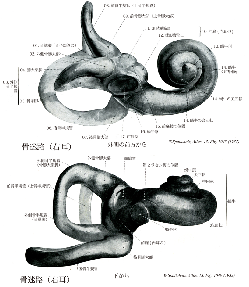1048_06【Posterior semicircular canal後骨半規管;後半規管 Canalis semicircularis posterior】 Canal situated furthest to inferior. It is situated nearly parallel to the axis of the petrous part of temporal bone. →(最も下方に位置する半規管、錐体軸に平行に位置する。 (Feneis))