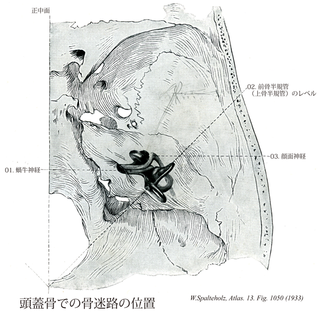 1050_02【Anterior semicircular canal前骨半規管;前半規管;上骨半規管 Canalis semicircularis anterior; Canalis semicircularis superior】 Anterior (superior) semicircular canal. It shares a common limb with the posterior semicircular canal and is situated vertically, nearly perpendicular to the axis of the petrous part of temporal bone. →(後[骨]半規管と共通の脚を有し、錐体軸に垂直に近く位置する。 (Feneis))