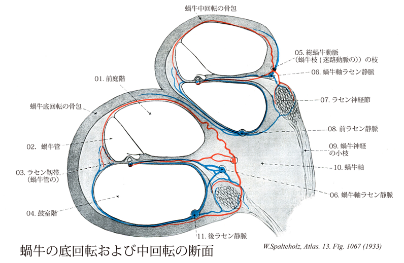 →(総蝸牛動脈は前前庭動脈とともに迷路動脈の最終枝として、蝸牛軸には入ってラセン神経節に分布し、さらに固有蝸牛動脈を蝸牛管におくり尖端から2回まわりのところに分布する。)