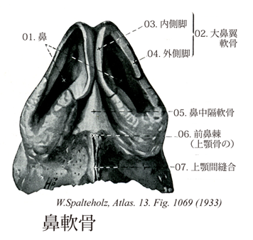 1069_00【Nasal cartilages; Greater nasal cartilage鼻軟骨 Cartilagines nasi】 Cartilaginous parts forming the nonosseous supporting framework of the nose. →(外側鼻軟骨は鼻背を形づくる。大鼻翼軟骨の外側脚は鼻翼を支え、内側脚は鼻中隔軟骨下縁につづき中隔可動部をつくる。鼻中隔軟骨前下縁の左右両側に鋤鼻軟骨が位置する。大鼻翼軟骨辺縁に小鼻翼軟骨、副鼻軟骨をみる。(解剖学辞典:吉村不二夫))