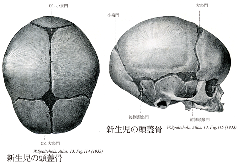 114_00【Fontanelles頭蓋泉門 Fonticuli cranii】 Membrane-filled gaps between the cranial bones in children. →(胎児、新生児、幼児の頭蓋冠において結合組織性骨の骨化が完了していない部分をいい、結合組織性の膜によってふさがれており、動脈の拍動を観察または触手することができる。頭蓋泉門のうちで恒常性のものは大泉門、小泉門、前側頭泉門、後側頭泉門である。頭蓋泉門の以上として眉間の上方に眉間泉門がある。また過剰骨として大泉門部にブレグマ骨、小泉門部に前頭頭頂間骨、前側頭泉門部に翼上骨、後側頭泉門部にアステリオン骨を認めることがある。)