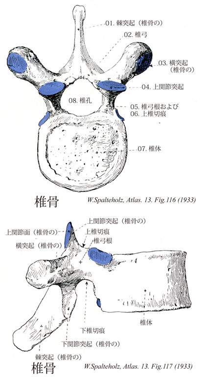 →(椎骨を側面からみると、椎弓の根もと(椎弓根)の上面と下面はそれぞれ小刀でえぐられたような曲面をなしている。この下面の切れ込みを下椎切痕とよぶ。)