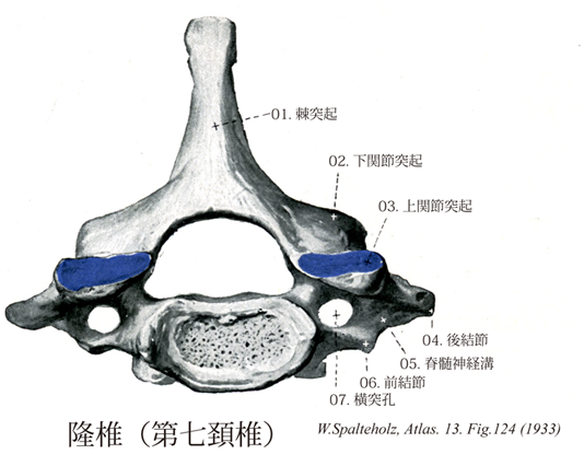 124_00【Vertebra prominens; Seventh cervical vertebra; C7 vertebra; [CVII]隆椎;第7頚椎 Vertebra prominens; Vertebrae cervicalis VII; [CVII]】 Seventh cervical vertebra. Its name originates from its prominent spinous process (in 70%). →(第七頚椎は、頚椎のなかでも最も下にあるだけあって、多分に胸椎に似た性格をおびてくる。椎体の大きさも上位の胸椎と大差がないし、棘突起も長大で、尖端の2部は見られない。上・下関節突起にある関節面の傾斜もかなり急になってきている。第7頚椎の棘突起は、生体で「クビ」を前に曲げたときに最も後方に突出している見えることが多い。そのために第7頚椎は隆椎という別名を持っている。)