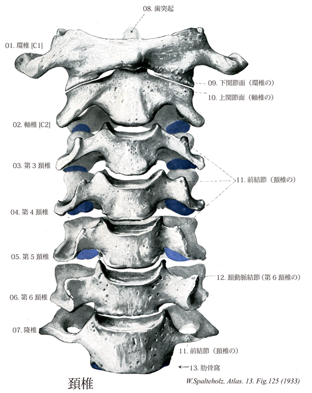 →(脊柱上部の7個の椎骨。ナマケモノ2種を除くすべての哺乳類の頚椎は7個で共通している。第1頚椎(環椎)と第2頚椎(軸椎)は特異的な形をしているが、他の5個の頚椎は共通の特徴をもつ。第3~第7頚椎は下位のものほど大きいが、椎体は小さくて丈が低く、上・下面は前後に圧平された楕円形をしている。椎弓はやや横に張り出し、椎孔の形は三角形に近く、その内径も大きい。頚椎の横突起は他の椎骨に比して著しく幅が広く、かつ短い。その前半は肋骨の遺残であり、後半は本来横突起であって、上面では両者の間に脊髄神経溝がみられる。横突起の前後両部の間を、横突孔というかなり大きな孔が貫通しており、椎骨動脈が通っている。頚椎の棘突起は台7頚椎を除いて、一般に短小であり、ほぼ水平であるが、下位のものほど斜め後下方に傾斜する。棘突起の尖端は、多くは二分しており、その間を項靱帯が上下に走る(第6頚椎では二分が不明瞭なことがあり、第7頚椎では二分していない)。第7頚椎の棘突起は長大で、尖端が結節状に肥厚しており、皮膚の上から容易に触知できるので隆椎とよばれる。頚椎の上および下関節突起は丈が低く、前者は後上方に、後者は前下方に向かっており、下位の頚椎ほど突起の傾斜が著しい。第7頚椎では横突起の前半部が遊離していることがあり、頚肋という。)