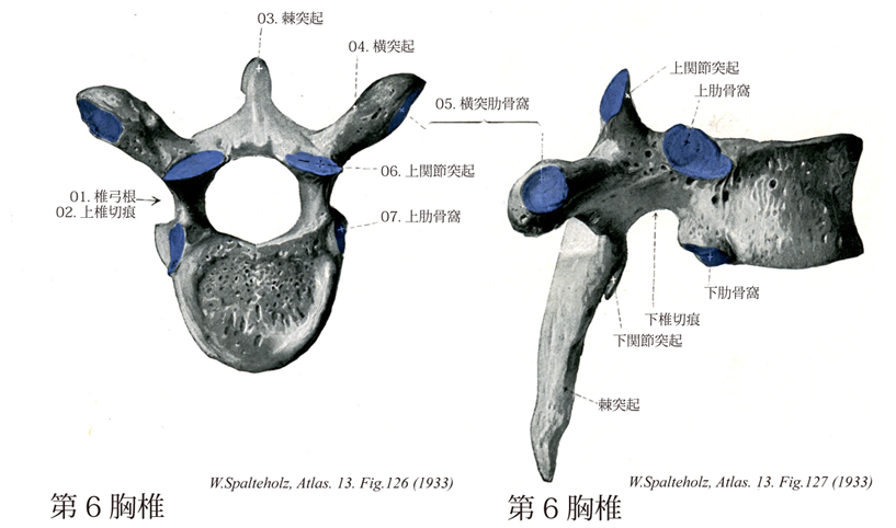 126_07【Superior costal facet上肋骨窩 Fovea costalis superior; Fovea costalis cranialis】 Articular fossa for the head of the rib located on the superior margin of the vertebral body at the root of the vertebral arch. →(第2~第9胸椎椎体の側面後部の上下両端には半円形の上肋骨窩および下肋骨窩があり、となりあう椎骨の上下のものが合して1個の肋骨頭に対する。その他の胸椎では肋骨との関節状態がこれとは異なる。第1胸椎では上肋骨窩が完全な円である。これは第1肋骨が第7頚椎と結合しないで、第1胸椎とだけ連接するためである。第11と第12胸椎は各1個の完全な肋骨窩をその側面中央部に持つが、第10胸椎には上端に半窩としての上肋骨窩を認めるばかりである。これは下位にある肋骨の連結部が下位の胸椎ほど次第に下方に移り、第11および第12肋骨が第11および第12胸椎のみと連接するからである。)
