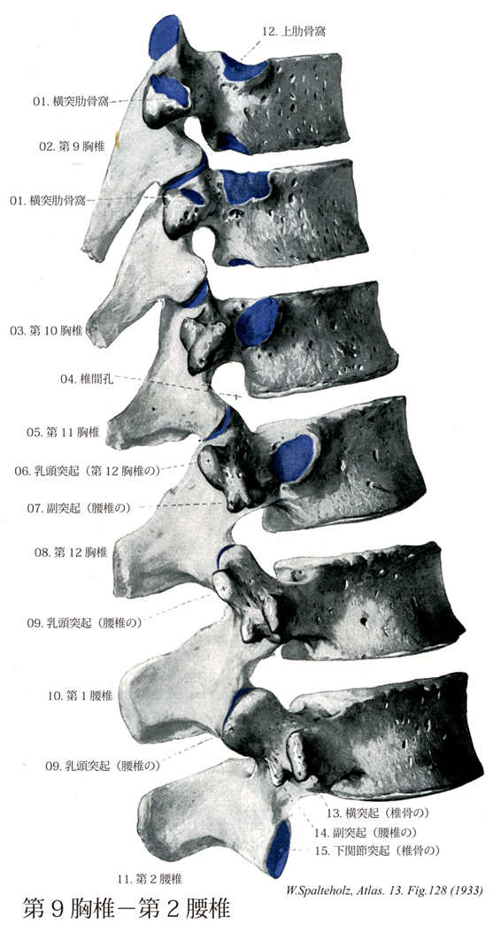 128_14【Accessory process of lumbar vertebra副突起(腰椎の) Processus accessorius vertebrae lumbalis】 Rudiment of the original transverse process of the lumbar vertebrae projecting posteriorly from the base of the costal process. →(肋骨突起の下縁を根もとの方にたどると、短いつららのような小突起が下後方に突出している。横突起尖端の下部は、その外方から出る小さな棘状の[腰椎の]副突起であって、これこそが本来の横突起の変形したものである。)