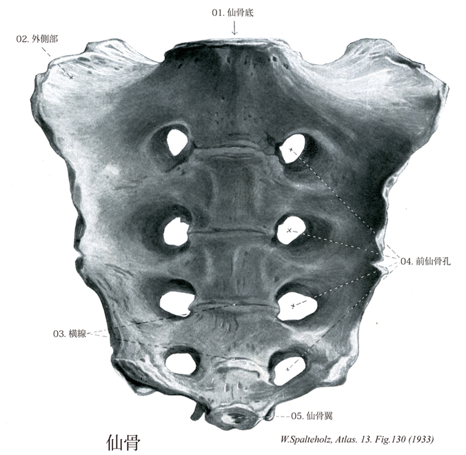 130_04【Anterior sacral foramina前仙骨孔 Foramina sacralia anteriora; Foramina sacralia pelvina】 Openings in the anterior surface of the sacrum for the exit of the sacral nerves. They were formed by the fusion of vertebrae, rudimentary ribs, and ossified ligaments. →(仙骨前面の横線の両端には4対の前仙骨孔がある。)