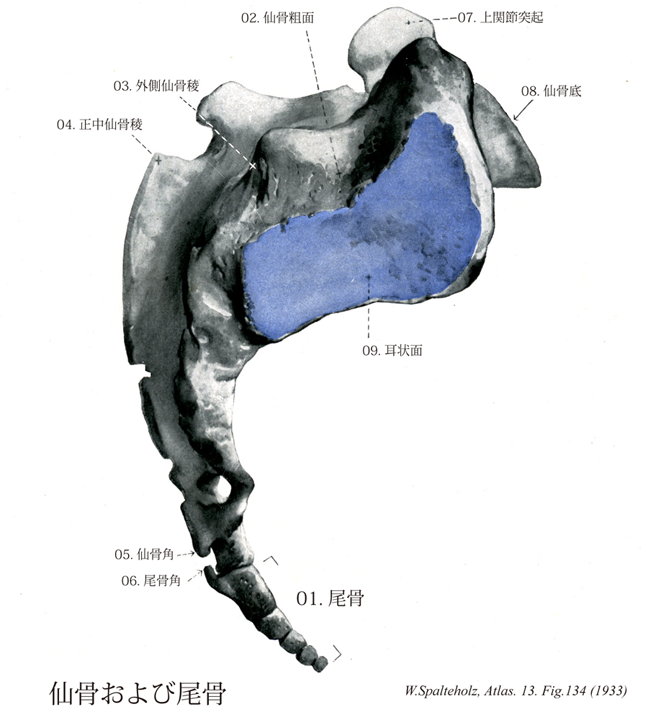 134_09【Auricular surface (of sacrum)耳状面(仙骨の) Facies auricularis (Os sacrum)】 Ear-shaped surface at the level of the upper 2-3 sacral vertebrae for articulation with the ilium. →(外側部の外側(すなわち、仙骨の外側縁)の上部は厚く、下部は薄い。上部には腸骨と連接する幅の広い半月形の耳状面がある。)