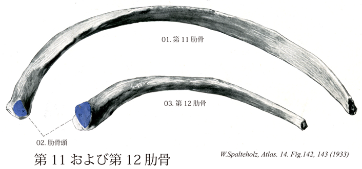 142_02【Head of rib肋骨頭;肋骨小頭 Caput costae; Capitulum costae】 The part of the rib that articulates with the vertebral column. →(肋骨頭は肋硬骨の後端のふくらみで、ここには胸椎椎体(の肋骨窩)と関節する関節面(肋骨頭関節面)がある。この関節面は第2~10肋骨ではクサビ状の立体形をしている。肋骨頭から3cm足らず離れたところに肋骨結節という楕円形の高まりが後方に突出している。この結節の表面には胸椎の横突起(の横突肋骨窩)と関節する関節面(肋骨結節関節面)がる。)