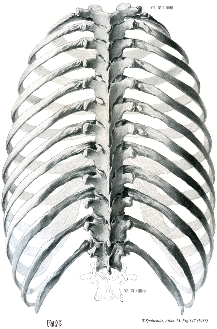 →(胸郭は脊柱(胸椎)、肋骨及び胸骨の3者で構成され、それらによって囲まれた腔即ち胸郭の内腔を胸腔という。この腔と、内臓系の胸膜腔とは、まったく別のものであるから注意のこと。胸郭を前面から見ると下縁が左右ともに、下方へ凸弯している。これを肋骨弓という。左右の肋骨弓の間にできる角を胸骨下角といい、約70゜である。胸椎、肋骨、胸骨が構成する骨格を胸郭という場合と、この骨格が構成する体幹の部分を胸郭という場合とがある。胸郭(骨格)の前壁は胸骨、肋軟骨、肋骨の前端部からなり、側壁は肋骨体、後壁は肋骨の後端部と胸椎からなる。これらの囲まれた内腔が胸腔である。胸郭は上方が狭く、前後に圧平された樽状を呈し、前後径より左右径が大きい。第7肋骨の胸骨への付着部と、第9または第10胸椎をまわる部分が最もふくらんでいる。ただし、新生児の胸郭は底面が広い円錐形である。脊柱の両側では肋骨が後方より突出しているので、胸腔の横断面は腎臓形を呈している。脊柱の両側では肋骨が後方へ弯曲している。このためにできる縦方向の溝が肺溝で、肺の後端が入る。下位肋骨の肋骨角ほど外方にあるため、肺溝は下方ほど幅が広い。胸郭の背面で、極遠きと横突起の間に深い縦溝、横突起と肋骨角の間に浅い立て溝がある。吸気時に肋骨は、肋骨頭と肋骨結節とを結ぶ線を軸に挙上するので、前後径、左右径とも大きくなる。下位肋骨は斜径が強いため、肋骨窩部が強く前方に押し出される。第1胸椎、第1肋骨、胸骨柄上縁で囲まれる部分が胸郭上口で、後縁より前縁が下方にあり、男性より女性で傾斜が強い。また、胸骨柄上縁は第2胸椎下縁に位置する。第12胸椎、第12肋骨、第11肋骨尖端、肋骨弓、剣状突起の連なる部分が胸郭下口で、横隔膜によってふさがれている。第7・第8・第9・第10肋軟骨が連結し、胸骨体と剣状突起の境界部にいたる前下縁が肋骨弓で、左右の肋骨弓が剣状突起のところで合して、約70度の角度をなす部分が胸骨下角である。おのおのの上下の肋骨間の隙間が肋間隙で、11個ある。最下の2個は前方に開いている。第7および第8肋間隙が最も長く広いが、上下に行くにしたがって短く狭くなる。1個の肋間隙では、後方より前方で広く、肋骨体と肋軟骨の境界部で最も広いが、前方に行くにしたがって再び狭くなる。胸椎と肋骨との間には肋椎関節があり、この関係は更に肋骨頭関節と肋横突関節との2つに分けられる。そしてこの両関節を結ぶ線として上下の方向に回転運動が行われる。これがいわゆる胸式呼吸運動である。上位7対の肋軟骨はおのおの別々に胸骨との間に胸肋関節を営むがⅧ~Ⅹ(Ⅸ)の肋軟骨は胸骨とは直接のつながりがなく、それぞれ直ぐ上の肋軟骨とくっついていて、結局Ⅶ肋軟骨を介して直接に胸骨につながる。しかし(Ⅹ)、ⅩⅠ、ⅩⅡの肋骨は非常に短くて胸骨とは全く関係がない。なおⅤあるいはⅥ~Ⅸの肋軟骨は隣り合う2つの肋軟骨が半関節で結ばれていて(軟骨管関節)、上下のものがくっついている。胸郭はほぼ円錐形のカゴのようなもので、その中に胸腔という広い空間を包み、肺や心臓を容れる。胸郭上口からは頚部の内臓、血管、神経が入り、胸郭下口には横隔膜が張っていて、胸腔と腹腔を境する。また肋間隙には肋間筋および肋間の血管や神経がある。胸郭の前下端すなわち胸郭下口の前縁ではⅧ~Ⅹの肋軟骨が合して、左右それぞれ弓状のカーブをえがくので、肋骨弓といわれ、左右の肋骨弓が胸骨の下端で合してなす角度は約70°で、そこを胸骨下角という。胸骨の体と柄が結合するところは前に突き出ており、身体の表面から触れることができる。ここを胸骨角と名付け、ちょうど第二胸骨関節の高さに相当するので、肋骨の高さを決めるとき目印になる。胸郭の後面をみると、肋骨が前外方に方向を変えるところは急に曲がるので、肋骨角といわれる。胸郭の内面では助骨角に相当するところが凹んでおり、肺の後縁を容れる。この部分は胸郭全体からみると大きな溝をなすので肺溝と呼ばれる。胸郭を構成する脊椎(胸椎)は全体として、生理的に軽い胸部弯曲になっているが、これがひどくなったものは脊椎後弯症といわれる。胸郭の形は人と四足動物とで大きな違いがある。その原因は人間が立って歩くようになったためと考えられる。すなわち人の胸郭は平たく、肋骨が脊柱よりも後ろに張り出しており、従って身体の重みを支える脊柱は胸郭の中心に近いところを通るようになっている。しかるに四足動物の胸郭は腹背径の方が左右径よりも大きく、また助骨角の角度が鋭くない。そして肋骨は脊柱よりも背方に飛び出るようなことはなく、脊柱が胸郭の最背部(つまり一番上)にあって、胸郭を吊っているような形になっている。人の脊柱を家の柱に例えると、四足動物は梁に相当する。体重を支える脊柱が人では身体の中心部に近い所を通っており、しかも胸郭の前後径が短いことは立って歩くときに安定がよいことに
