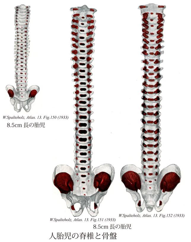 151_00a【Pelvis骨盤 Pelvis】 The part of the trunk bounded by the abdomen and the pelvic diaphragm. The greater and lesser pelvis are divided by the linea terminalis. →(骨盤を形づくる骨は左右の寛骨とそれらの間にある仙骨ならびに尾骨とである。寛骨は腸骨、坐骨および恥骨の3個の骨が合して1つの骨となったもので、胎生期から少年期までは軟骨によって結合されているが、16~17才頃に骨化して完全にくっつく(骨結合)。これら3つの骨がY字型に合するところは股関節の関節窩に相当し、寛骨臼といわれ、臼のような形に凹んでいる。仙骨は5個の仙椎が癒合して1つの骨なったものであり、また尾骨も3~6個の小さい尾椎がくっついて1つの骨になったものである。さて、左右の寛骨は前の方では線維軟骨によって結合(線維軟骨結合)されており、恥骨結合とよばれる。後ろの方では寛骨の茸状面と仙骨の同じ名の面とが仙骨関節によって結合される。仙腸関節は関節という名がついているけれども、向かい合う関節面の形や大きさがほぼ同じで、そのうえ関節包は狭く、且つ4つの短いが、強い仙腸靱帯により結びつけれているので、ほとんど動かない(半関節)。骨盤は大骨盤と小骨盤とに区分され、その界には分界線がある。分界線は岬角(第5腰椎と仙骨の結合するところで、前下にとびだしている)、腸骨の弓状線、恥骨櫛および恥骨結合の上縁を結ぶ線の事で、その囲む面は平面に近い。大骨盤は広く、浅い鉢のような容器で、腹腔の下部に位し、腹部内臓を容れる。外側には腸骨翼があり、後ろには仙骨の上端があるが、そのほかに第4、5腰椎と腸骨稜との間に張る腸腰靱帯もまた後壁をなす。しかし前は開放されている。また上前腸骨棘と恥骨結節との間には鼡径靱帯があり、これと腸骨前縁との間を腸腰筋や血管が通る。小骨盤は短い円筒状で、骨盤腔の中に骨盤内臓を容れる。ふつう骨盤といえば小骨盤(狭義の骨盤)だけをさすが、大骨盤を含めた広義の骨盤は骨格の中でも性差の最もはっきりした部分で、産科学で重要視される。小骨盤の前壁は恥骨、両側壁は坐骨と腸骨の一部でつくられる。前外側壁には閉鎖孔があり、閉鎖孔のところだけを残して閉鎖膜が張っており、筋のつき場所となる。後壁は仙骨と尾骨でつくられるが、大部分は骨のないところで、ほぼ縦に走る仙結節靱帯と、その前でこれと交叉するように横に張る仙棘靱帯の両者がここを補っている。大と小の坐骨切痕は仙結節靱帯によりそれぞれ大と小の坐骨孔にわけられる。そして大坐骨孔は梨状筋(仙骨前面から起こり、大転子につく)が骨盤の外へ出る通路をなし、またこの孔の中で梨状筋より上の部分を梨状筋上孔といい、上臀神経と同名の血管が通る。下の部分を梨状筋下孔といい、坐骨神経、下臀神経と同名の血管、陰部神経と同名の血管が通る。また小坐骨孔は内閉鎖筋(骨盤の内面)で、閉鎖膜とそのまわりから起こり、大転子につく)の腱が骨盤の外へ出る通路をなす。小骨盤の入口は分界線によって囲まれ、小骨盤の出口は坐骨結節、恥骨下縁および尾骨の下端を結ぶ凸凹の線によって境される。なお骨盤の入口と出口の前後径の各中点を通る前に向かって凹な曲線を骨盤軸といい、分娩のとき胎児の頭が通る道(産道)の軸をなす。恥骨結合の下部は恥骨価格といわれ、男では角度が急であり、女では角度が鈍く弓状をなすので、恥骨弓と呼ばれる。骨盤の出口をふさぐ軟部組織として前上に尿生殖角隔膜と深会陰横筋がある。これらを男では尿道、女では尿道と腟が貫く。また後ろ下には肛門挙筋があり、内閉鎖筋の筋膜の一部(腱弓といわれ、特に丈夫になっている部分)から起こり、漏斗上に肛門に付く。骨盤は全身の骨格のなかで性差の最もはっきりした部分で、特に目立つのは小骨盤腔(狭義の骨盤腔)が女では男よりもひろく、たけが低いことであるこれは分娩ということを考えれば当然である。Pelvisはギリシャ語のpelisに由来するラテン語で、ローマ時代には縁がややめくれた広口の深い容器を意味した。骨盤のことをpelvisというようになったのは16世紀の末である。)