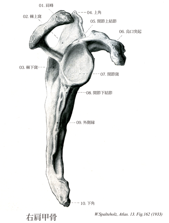 →(肩甲骨の外側角は先がそぎ取られたようになっており、ここに上腕骨と関節する大きな関節窩が西洋ナシの輪郭をした浅いくぼみを作っている。)