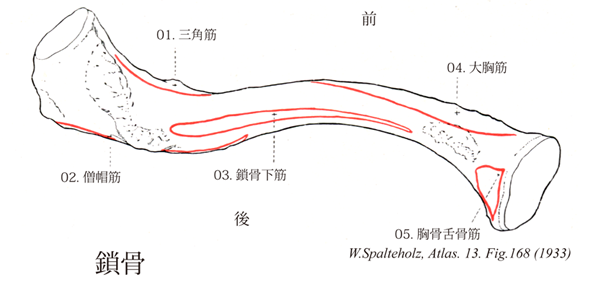168_03【Subclavius; Subclavius muscle鎖骨下筋 Musculus subclavius】 o: First costal cartilage, i: Inferior surface of clavicle. Stabilizes the sternoclavicular joint against being drawn laterally. I: Subclavian nerve. →(鎖骨下筋は体幹から起こって上肢帯に至る腹側の筋で、第1肋骨と肋軟骨の上縁から起始し、鎖骨下面の溝につ付着する。作用として鎖骨を引き下げ、前方に突き出す。神経支配は第5,6頚神経(鎖骨下筋への神経)。動脈は胸肩峰動脈の鎖骨枝から受ける。鎖骨下筋は小さく、烏口鎖骨靱帯によって前方から被われている。)