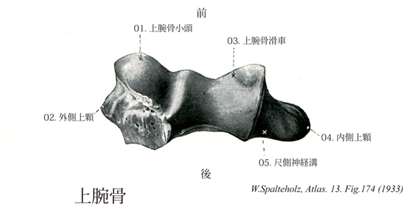 →(上腕骨滑車は後面からもよく観察されるが、内側上顆の後面で上腕骨滑車のすぐそばを尺骨神経が上下に走るための浅い不明瞭な溝(尺骨神経溝)がある。)