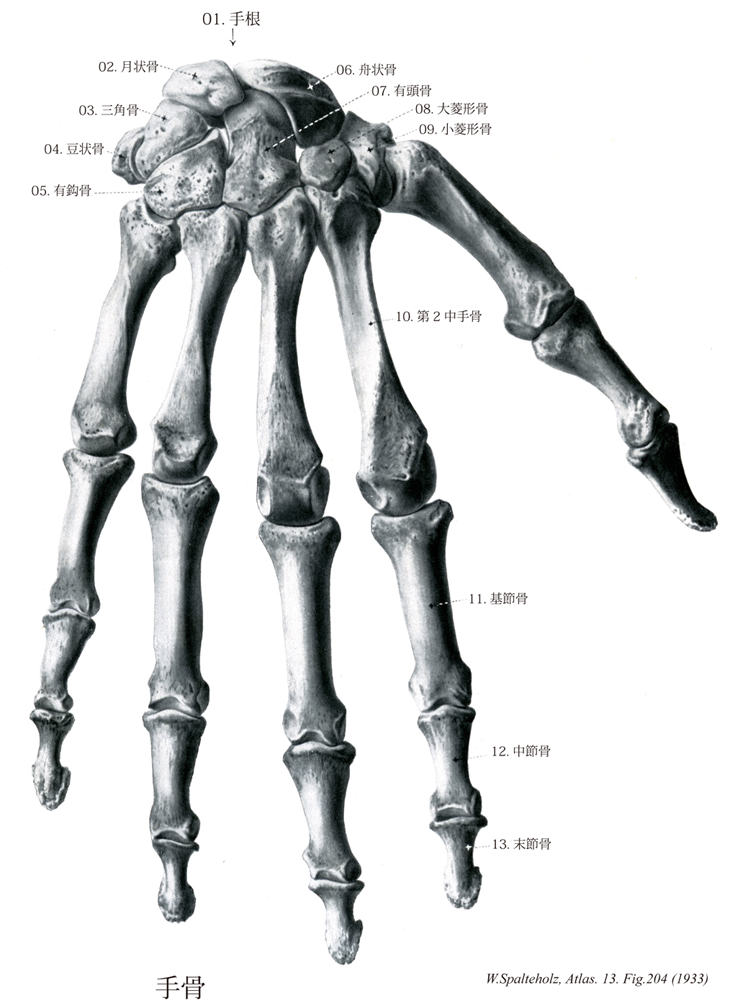204_11【Proximal phalanx of hand基節骨(手の) Phalanx proximalis manus】 Proximal bone of a finger. →(基節骨は掌側は平らで、手背側は横方向に凸をなし、屈筋の線維性腱鞘が付着するためのとがった粗な角をもっている。基節骨には体があり、遠位には頭、近位には底がある。頭はまた頭の関節面は滑車状になっている(滑車ともいわれる)。底には横長の卵円形のくぼんだ関節面があり、中手骨と関節でもって連結している。基節骨は第3指のものが最もながい。)