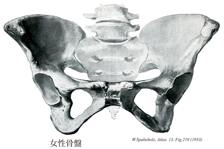 →(骨盤を形づくる骨は左右の寛骨とそれらの間にある仙骨ならびに尾骨である。寛骨は腸骨、坐骨および恥骨の3個の骨が合して1つの骨となったもので、胎生期から少年期までは軟骨によって結合されているが、16~17才頃に骨化して完全に一つの寛骨となる(骨結合)。これら3つの骨がY字型に合するところは股関節の関節窩に相当し、寛骨臼といわれ、臼のような形に凹んでいる。仙骨は5個の仙椎が癒合して1つの骨なったものであり、また尾骨も3~6個の小さい尾椎がくっついて1つの骨になったものである。さて、左右の寛骨は前の方では線維軟骨によって結合(線維軟骨結合)されており、恥骨結合とよばれる。後ろの方では寛骨の茸状面と仙骨の同じ名の面とが仙骨関節によって結合される。仙腸関節は関節という名がついているけれども、向かい合う関節面の形や大きさがほぼ同じで、そのうえ関節包は狭く、且つ4つの短いが、強い仙腸靱帯により結びつけれているので、ほとんど動かない(半関節)。骨盤は大骨盤と小骨盤とに区分され、その界には分界線がある。分界線は岬角(第5腰椎と仙骨の結合するところで、前下にとびだしている)、腸骨の弓状線、恥骨櫛および恥骨結合の上縁を結ぶ線の事で、その囲む面は平面に近い。大骨盤は広く、浅い鉢のような容器で、腹腔の下部に位し、腹部内臓を容れる。外側には腸骨翼があり、後ろには仙骨の上端があるが、そのほかに第4、5腰椎と腸骨稜との間に張る腸腰靱帯もまた後壁をなす。しかし前は開放されている。また上前腸骨棘と恥骨結節との間には鼡径靱帯があり、これと腸骨前縁との間を腸腰筋や血管が通る。小骨盤は短い円筒状で、骨盤腔の中に骨盤内臓を容れる。ふつう骨盤といえば小骨盤(狭義の骨盤)だけをさすが、大骨盤を含めた広義の骨盤は骨格の中でも性差の最もはっきりした部分で、産科学で重要視される。小骨盤の前壁は恥骨、両側壁は坐骨と腸骨の一部でつくられる。前外側壁には閉鎖孔があり、閉鎖孔のところだけを残して閉鎖膜が張っており、筋のつき場所となる。後壁は仙骨と尾骨でつくられるが、大部分は骨のないところで、ほぼ縦に走る仙結節靱帯と、その前でこれと交叉するように横に張る仙棘靱帯の両者がここを補っている。大と小の坐骨切痕は仙結節靱帯によりそれぞれ大と小の坐骨孔にわけられる。そして大坐骨孔は梨状筋(仙骨前面から起こり、大転子につく)が骨盤の外へ出る通路をなし、またこの孔の中で梨状筋より上の部分を梨状筋上孔といい、上臀神経と同名の血管が通る。下の部分を梨状筋下孔といい、坐骨神経、下臀神経と同名の血管、陰部神経と同名の血管が通る。また小坐骨孔は内閉鎖筋(骨盤の内面)で、閉鎖膜とそのまわりから起こり、大転子につく)の腱が骨盤の外へ出る通路をなす。小骨盤の入口は分界線によって囲まれ、小骨盤の出口は坐骨結節、恥骨下縁および尾骨の下端を結ぶ凸凹の線によって境される。なお骨盤の入口と出口の前後径の各中点を通る前に向かって凹な曲線を骨盤軸といい、分娩のとき胎児の頭が通る道(産道)の軸をなす。恥骨結合の下部は恥骨価格といわれ、男では角度が急であり、女では角度が鈍く弓状をなすので、恥骨弓と呼ばれる。骨盤の出口をふさぐ軟部組織として前上に尿生殖角隔膜と深会陰横筋がある。これらを男では尿道、女では尿道と腟が貫く。また後ろ下には肛門挙筋があり、内閉鎖筋の筋膜の一部(腱弓といわれ、特に丈夫になっている部分)から起こり、漏斗上に肛門に付く。骨盤は全身の骨格のなかで性差の最もはっきりした部分で、特に目立つのは小骨盤腔(狭義の骨盤腔)が女では男よりもひろく、たけが低いことであるこれは分娩ということを考えれば当然である。Pelvisはギリシャ語のpelisに由来するラテン語で、ローマ時代には縁がややめくれた広口の深い容器を意味した。骨盤のことをpelvisというようになったのは16世紀の末である。)