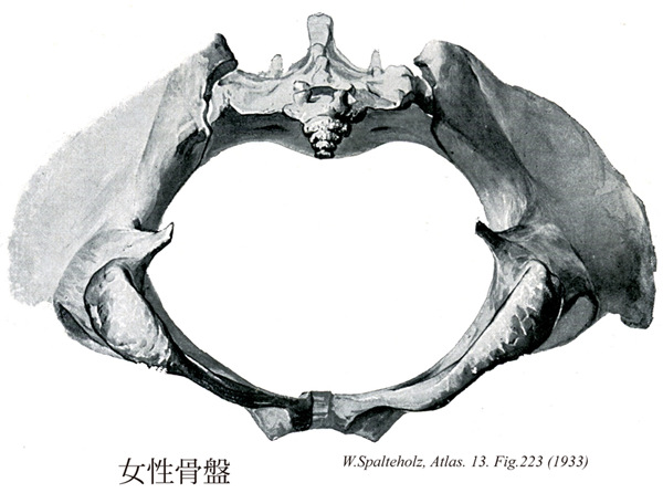→(骨盤を形づくる骨は左右の寛骨とそれらの間にある仙骨ならびに尾骨である。寛骨は腸骨、坐骨および恥骨の3個の骨が合して1つの骨となったもので、胎生期から少年期までは軟骨によって結合されているが、16~17才頃に骨化して完全に一つの寛骨となる(骨結合)。これら3つの骨がY字型に合するところは股関節の関節窩に相当し、寛骨臼といわれ、臼のような形に凹んでいる。仙骨は5個の仙椎が癒合して1つの骨なったものであり、また尾骨も3~6個の小さい尾椎がくっついて1つの骨になったものである。さて、左右の寛骨は前の方では線維軟骨によって結合(線維軟骨結合)されており、恥骨結合とよばれる。後ろの方では寛骨の茸状面と仙骨の同じ名の面とが仙骨関節によって結合される。仙腸関節は関節という名がついているけれども、向かい合う関節面の形や大きさがほぼ同じで、そのうえ関節包は狭く、且つ4つの短いが、強い仙腸靱帯により結びつけれているので、ほとんど動かない(半関節)。骨盤は大骨盤と小骨盤とに区分され、その界には分界線がある。分界線は岬角(第5腰椎と仙骨の結合するところで、前下にとびだしている)、腸骨の弓状線、恥骨櫛および恥骨結合の上縁を結ぶ線の事で、その囲む面は平面に近い。大骨盤は広く、浅い鉢のような容器で、腹腔の下部に位し、腹部内臓を容れる。外側には腸骨翼があり、後ろには仙骨の上端があるが、そのほかに第4、5腰椎と腸骨稜との間に張る腸腰靱帯もまた後壁をなす。しかし前は開放されている。また上前腸骨棘と恥骨結節との間には鼡径靱帯があり、これと腸骨前縁との間を腸腰筋や血管が通る。小骨盤は短い円筒状で、骨盤腔の中に骨盤内臓を容れる。ふつう骨盤といえば小骨盤(狭義の骨盤)だけをさすが、大骨盤を含めた広義の骨盤は骨格の中でも性差の最もはっきりした部分で、産科学で重要視される。小骨盤の前壁は恥骨、両側壁は坐骨と腸骨の一部でつくられる。前外側壁には閉鎖孔があり、閉鎖孔のところだけを残して閉鎖膜が張っており、筋のつき場所となる。後壁は仙骨と尾骨でつくられるが、大部分は骨のないところで、ほぼ縦に走る仙結節靱帯と、その前でこれと交叉するように横に張る仙棘靱帯の両者がここを補っている。大と小の坐骨切痕は仙結節靱帯によりそれぞれ大と小の坐骨孔にわけられる。そして大坐骨孔は梨状筋(仙骨前面から起こり、大転子につく)が骨盤の外へ出る通路をなし、またこの孔の中で梨状筋より上の部分を梨状筋上孔といい、上臀神経と同名の血管が通る。下の部分を梨状筋下孔といい、坐骨神経、下臀神経と同名の血管、陰部神経と同名の血管が通る。また小坐骨孔は内閉鎖筋(骨盤の内面)で、閉鎖膜とそのまわりから起こり、大転子につく)の腱が骨盤の外へ出る通路をなす。小骨盤の入口は分界線によって囲まれ、小骨盤の出口は坐骨結節、恥骨下縁および尾骨の下端を結ぶ凸凹の線によって境される。なお骨盤の入口と出口の前後径の各中点を通る前に向かって凹な曲線を骨盤軸といい、分娩のとき胎児の頭が通る道(産道)の軸をなす。恥骨結合の下部は恥骨価格といわれ、男では角度が急であり、女では角度が鈍く弓状をなすので、恥骨弓と呼ばれる。骨盤の出口をふさぐ軟部組織として前上に尿生殖角隔膜と深会陰横筋がある。これらを男では尿道、女では尿道と腟が貫く。また後ろ下には肛門挙筋があり、内閉鎖筋の筋膜の一部(腱弓といわれ、特に丈夫になっている部分)から起こり、漏斗上に肛門に付く。骨盤は全身の骨格のなかで性差の最もはっきりした部分で、特に目立つのは小骨盤腔(狭義の骨盤腔)が女では男よりもひろく、たけが低いことであるこれは分娩ということを考えれば当然である。Pelvisはギリシャ語のpelisに由来するラテン語で、ローマ時代には縁がややめくれた広口の深い容器を意味した。骨盤のことをpelvisというようになったのは16世紀の末である。)