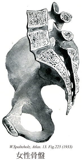 →(骨盤を形づくる骨は左右の寛骨とそれらの間にある仙骨ならびに尾骨である。寛骨は腸骨、坐骨および恥骨の3個の骨が合して1つの骨となったもので、胎生期から少年期までは軟骨によって結合されているが、16~17才頃に骨化して完全に一つの寛骨となる(骨結合)。これら3つの骨がY字型に合するところは股関節の関節窩に相当し、寛骨臼といわれ、臼のような形に凹んでいる。仙骨は5個の仙椎が癒合して1つの骨なったものであり、また尾骨も3~6個の小さい尾椎がくっついて1つの骨になったものである。さて、左右の寛骨は前の方では線維軟骨によって結合(線維軟骨結合)されており、恥骨結合とよばれる。後ろの方では寛骨の茸状面と仙骨の同じ名の面とが仙骨関節によって結合される。仙腸関節は関節という名がついているけれども、向かい合う関節面の形や大きさがほぼ同じで、そのうえ関節包は狭く、且つ4つの短いが、強い仙腸靱帯により結びつけれているので、ほとんど動かない(半関節)。骨盤は大骨盤と小骨盤とに区分され、その界には分界線がある。分界線は岬角(第5腰椎と仙骨の結合するところで、前下にとびだしている)、腸骨の弓状線、恥骨櫛および恥骨結合の上縁を結ぶ線の事で、その囲む面は平面に近い。大骨盤は広く、浅い鉢のような容器で、腹腔の下部に位し、腹部内臓を容れる。外側には腸骨翼があり、後ろには仙骨の上端があるが、そのほかに第4、5腰椎と腸骨稜との間に張る腸腰靱帯もまた後壁をなす。しかし前は開放されている。また上前腸骨棘と恥骨結節との間には鼡径靱帯があり、これと腸骨前縁との間を腸腰筋や血管が通る。小骨盤は短い円筒状で、骨盤腔の中に骨盤内臓を容れる。ふつう骨盤といえば小骨盤(狭義の骨盤)だけをさすが、大骨盤を含めた広義の骨盤は骨格の中でも性差の最もはっきりした部分で、産科学で重要視される。小骨盤の前壁は恥骨、両側壁は坐骨と腸骨の一部でつくられる。前外側壁には閉鎖孔があり、閉鎖孔のところだけを残して閉鎖膜が張っており、筋のつき場所となる。後壁は仙骨と尾骨でつくられるが、大部分は骨のないところで、ほぼ縦に走る仙結節靱帯と、その前でこれと交叉するように横に張る仙棘靱帯の両者がここを補っている。大と小の坐骨切痕は仙結節靱帯によりそれぞれ大と小の坐骨孔にわけられる。そして大坐骨孔は梨状筋(仙骨前面から起こり、大転子につく)が骨盤の外へ出る通路をなし、またこの孔の中で梨状筋より上の部分を梨状筋上孔といい、上臀神経と同名の血管が通る。下の部分を梨状筋下孔といい、坐骨神経、下臀神経と同名の血管、陰部神経と同名の血管が通る。また小坐骨孔は内閉鎖筋(骨盤の内面)で、閉鎖膜とそのまわりから起こり、大転子につく)の腱が骨盤の外へ出る通路をなす。小骨盤の入口は分界線によって囲まれ、小骨盤の出口は坐骨結節、恥骨下縁および尾骨の下端を結ぶ凸凹の線によって境される。なお骨盤の入口と出口の前後径の各中点を通る前に向かって凹な曲線を骨盤軸といい、分娩のとき胎児の頭が通る道(産道)の軸をなす。恥骨結合の下部は恥骨価格といわれ、男では角度が急であり、女では角度が鈍く弓状をなすので、恥骨弓と呼ばれる。骨盤の出口をふさぐ軟部組織として前上に尿生殖角隔膜と深会陰横筋がある。これらを男では尿道、女では尿道と腟が貫く。また後ろ下には肛門挙筋があり、内閉鎖筋の筋膜の一部(腱弓といわれ、特に丈夫になっている部分)から起こり、漏斗上に肛門に付く。骨盤は全身の骨格のなかで性差の最もはっきりした部分で、特に目立つのは小骨盤腔(狭義の骨盤腔)が女では男よりもひろく、たけが低いことであるこれは分娩ということを考えれば当然である。Pelvisはギリシャ語のpelisに由来するラテン語で、ローマ時代には縁がややめくれた広口の深い容器を意味した。骨盤のことをpelvisというようになったのは16世紀の末である。)
