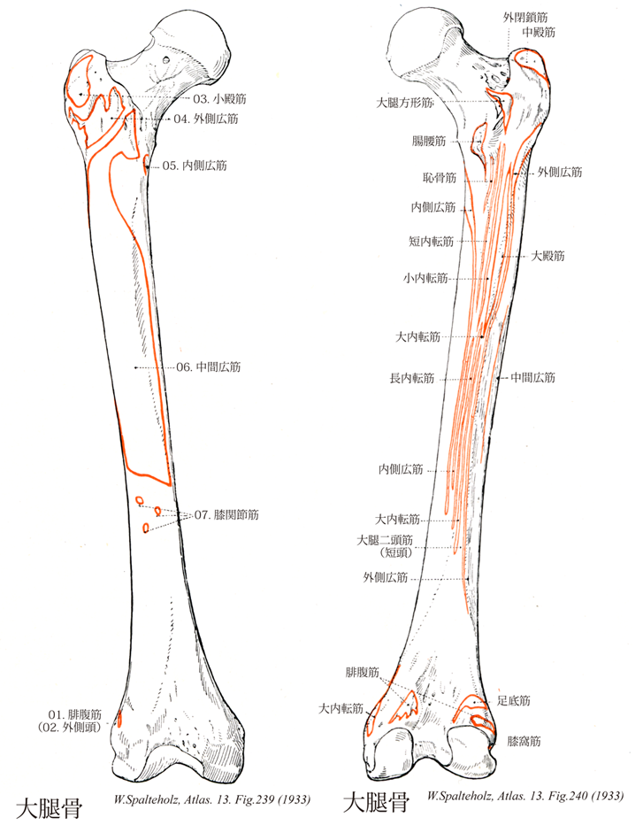 239_00【Femur; Thigh bone大腿骨 Femur; Os femoris】 →(大腿骨は人体で最長の管状骨で約40cmあり、身長のほぼ4分の1を占め、前方に軽く凸弯している。起立時遠位端は水平面上にあるが、大腿骨は垂直位をなさず、近位部が骨盤の幅だけ外方へずれる。また大腿骨頚の長軸と大腿骨遠位端の横軸とは同一平面上にはなく、大腿骨は長軸のまわりに骨頭が前方へ向く方向方向に約15度ねじれている。近位端(上端)で上内側やや前方へ突出する球状部が大腿骨頭であり、大腿骨頭の中心のやや後下方にある卵円形の粗面状小陥凹部分が大腿骨頭窩である。大腿骨頭と円柱状の大腿骨体を連結する細い部分が大腿骨頚で、大腿骨頚の中央部は細いが内および外側端で、とくに外側端で幅が広く前後にやや扁平となる。上縁は水平に、下縁は外下後方へ斜めに走っている。大腿骨頚と大腿骨体は、約125度の傾斜度で連結している。角度は生下時により成熟するにしたがい小さくなる。男性より女性の方が角度が小さい。大腿骨頚と大腿骨体との結合部の上外側にある大きな隆起が大転子で、結合部の後下部から内後方へ突出する部分が小転子である。大転子の後上部は上内側へ突出しやや深い陥凹部をつくる。この陥凹部が転子窩である。大転子の前面上内側部から大腿骨頚の前面を下内方に走り頚の下縁で小転子の前面にいたる粗な隆線が転子間線で、大腿骨頚と大腿骨体との結合部に相当する。転子間線は内下方へ伸びて渦状線へつづき、また下端近くで結節状に隆起して2次結節となることがある。大転子の後上角部から後面を下内包へ走り小転子にいたる比較的縁が丸い隆起が転子間稜で、頚と体との結合部に相当する。転子間稜の中央やや上外側部にある低い膨隆部分が方形筋結節である。円柱状の大腿骨体は中央部で細い上部で太く、下部では左右に幅が広くなる。大腿骨の長軸は立位で約10度脛骨の垂直線に対して外側へ傾いている。大腿骨体の中央1/3では3縁・3面がある。内側縁と外側縁は丸味をおびている。各3面とも平滑で、前面は内側縁と外側縁との間にあって前方へ凸面をなす。外側面は外側縁と後縁との間にあり、外側よりむしろ後方に面している。内側面は内側縁と後縁との間にあり内方やや後方にむいている。後縁の粗で幅広い線状隆起が粗線である。粗線の内および外側で稜状に隆起した部分がそれぞれ内側唇と外側唇で、栄養孔がこの両者の間で認められる。大腿骨体の上1/3では粗線が3本の線状隆起として拡散し、逆三角形の粗線である後面を形成する。下方で内側唇に、上方で転子間線の下端につづく内側の細い線状隆起が渦状線である。内側唇から小転子の基部へいたる中間位の線状隆起が恥骨筋線で、外側唇から上外方大転子の基部へ走る幅がある粗な線状隆起が臀筋粗面である。臀筋粗面は近位部で隆起し第三転子をつくることがある。大腿骨体の下1/3では内側部が前後に扁平化し、下端が広い三角柱状を呈する。内側唇は内下方の内側顆の後上方に、外側唇は外下方外側顆の後上方にいたる。前者が内側上顆線、後者が外側上顆線である。これらに境され浅く陥凹した三角形の平滑な面が膝蓋面である。内側上顆線の上方は大腿動脈が斜走するため不明瞭となっている。大腿骨の遠位端(下端)大きく膨隆している。内側の隆起が内側顆、外側の隆起が外側顆である。内側窩は内下方および後方へ、外側顆は下方・後方および前上方に突出する部分が内側上顆で、内側上顆上方の小さな突起が内転筋結節である。外側顆は内側顆より外側への膨隆度が小さく、大腿骨体の外側面からほとんどでていない。外側面後上方で外側へ突出する部分が外側上顆である。内側顆と外側顆は大腿骨の前面で互いに連絡するが、後面では深い間隙で隔てられている。この間隙が顆間窩である。内側顆と外側顆の後縁を結ぶ稜状隆起が顆間窩で、顆間窩の上縁をなし膝蓋面との境をなす。前下方は膝蓋面の下縁で境される。内側顆と外側顆の下面および後面の凸面をなす帯状の関節面が脛骨上端と関節する脛骨面である。脛骨面は内側顆にあり前外方へ弯曲する内側部と、外側顆にあり幅広く前後に直線的に走る外側部とに分けられる。内外の両側部が両顆の前方で互いに癒合し、膝蓋骨後面に接する関節面が膝蓋面である。膝蓋面は中央の縦溝で内外に二分されるが、外側部が大きい。ラテン語のFemur(大腿)に由来する。)