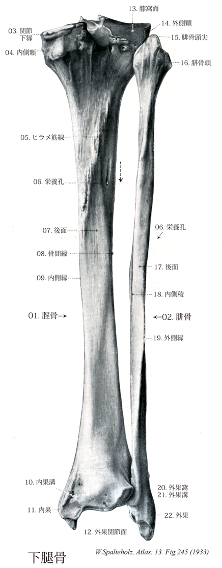 245_05【Soleal lineヒラメ筋線;膝窩筋線 Linea musculi solei; Linea poplitea】 Bony ridge on the posterior surface of the tibia that extends obliquely from superolateral to inferomedial, giving origin to the soleus muscle. →(ヒラメ筋線は腓骨の小関節面から脛骨の後部を横切って、斜め下方へのびる隆線。ヒラメ筋の起始となる。ヒラメ筋線より上方の三角形の面から膝窩筋、ヒラメ筋線からはヒラメ筋が起こる。ヒラメ筋線より下方では栄養孔の内方を縦に通る極めて不明瞭な隆起線を境として、それより広い内側から長趾屈筋、狭い外側から後脛骨筋が起こる。すなわち、この縦線は後脛骨筋を被う線維膜の着く線である。)