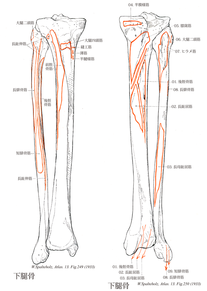 →(後脛骨筋は骨間膜の広い領域から起こる。狭い辺縁部は腓骨と脛骨の近位部に起こり、浅い線維束は浅深の屈筋間にある結合組織から起こる。後脛骨筋の腱は内果上方で長趾屈筋の腱の下を横切り(下腿腱交叉)、その主束は舟状骨粗面につき、その外側束は(しばしば)すべての遠位足根骨と第2~4中足骨底の足底面に付く。内果溝で後脛骨筋の腱は腱鞘に包まれ、内果下方では屈筋支帯におおわれている。深屈筋群へ脛骨神経の筋枝の中で後脛骨筋への枝はほかの枝よりもずっと近位、ヒラメ筋腱弓のレベルで出る。母趾とそのほかの趾への長屈筋群に対する近位の枝は下腿中位1/3へうつるレベルで脛骨神経から分かれる。脛骨神経からの筋枝は普通下腿遠位1/2からも分かれる。後脛骨筋は脛骨神経の支配を受ける。この筋の収縮により距腿関節における足の底屈、距骨下関節および横足根関節による足の内反が得られる。この筋は内層の縦足弓を維持するうえにも重要である。この筋の収縮が足底で数個の骨を互いに引き寄せるうえに役立つことにも注意すべきである。)