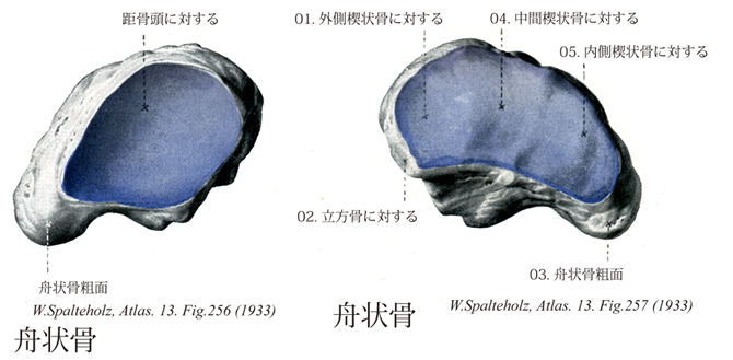257_00【Navicular bone舟状骨[足の] Os naviculare】 Bone situated medially between the head of the talus and the three cuneiform bones. →(足の舟状骨は中心足根骨に属し、足根の内側で距骨と楔状骨の間にある。前後に扁平な骨で、背側で凸面、足底側で凹面となっている。前面に3個の凸面の関節面があり、それぞれ内側楔状骨・中間楔状骨・外側楔状骨と関節する。後方は距骨頭に対する関節窩をなす。内側面は粗面状で下方に突出し舟状骨粗面をなす。皮下で触知できる。外側面で立方骨関節することも多い。底側面で舟状骨粗面に近い部に後脛骨筋腱の深層のものが通る浅い斜めの溝がある。ラテン語のNavisの縮小形Navicula(小舟)に由来する。)