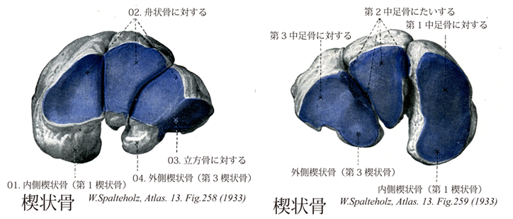 258_02【Navicular bone舟状骨[足の] Os naviculare】 Bone situated medially between the head of the talus and the three cuneiform bones. →(足の舟状骨は中心足根骨に属し、足根の内側で距骨と楔状骨の間にある。前後に扁平な骨で、背側で凸面、足底側で凹面となっている。前面に3個の凸面の関節面があり、それぞれ内側楔状骨・中間楔状骨・外側楔状骨と関節する。後方は距骨頭に対する関節窩をなす。内側面は粗面状で下方に突出し舟状骨粗面をなす。皮下で触知できる。外側面で立方骨関節することも多い。底側面で舟状骨粗面に近い部に後脛骨筋腱の深層のものが通る浅い斜めの溝がある。ラテン語のNavisの縮小形Navicula(小舟)に由来する。)