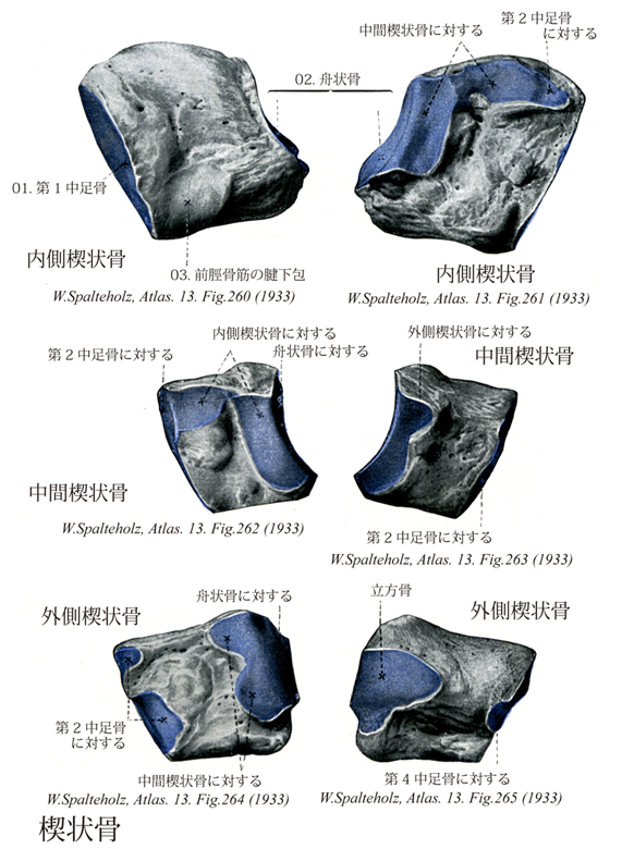 - 260_00【Medial cuneiform bone内側楔状骨;第一楔状骨 Os cuneiforme mediale; Os cuneiforme primum】 Wedge-shaped bone between the navicular and the first metatarsal. The base of the wedge is directed inferiorly.