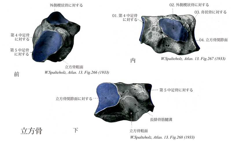 267_00【Cuboid bone立方骨;方形骨 Os cuboideum】 Bone located between the calcaneus and the fourth and fifth metatarsals. →(足根骨の遠位列に属し最外側にある。踵骨と第4および第5中足骨との間にあり、内側縁が外側縁より長く、背面が背外側に向いた立方形をしている。外側楔状骨の外側にあって上面が外方に傾いた立方状である。外側面から足底面にかけて後外側から前内側へ走る溝が長腓骨筋腱溝で、溝の後方を境する隆起が立方骨粗面である。内側面中央に外側楔状骨に対する関節面があり、この外後方に舟状骨に対する関節面がある。近位端に踵骨に対する大きな関節面が、遠位端には第4および第5中足骨底に対する関節面がある。ギリシャ語のKybos(立方体)+Oeides(様)に由来する。)