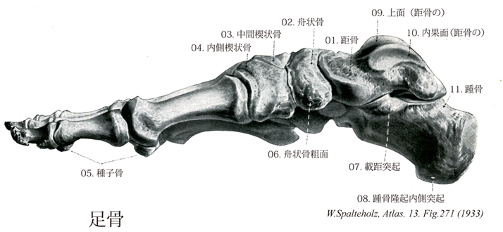 271_00【Bones of foot足の骨;足骨 Ossa pedis】 →(足の骨は足根骨・中足骨および足の趾骨とに大別できる。足の内側縁と外側縁との中点を結ぶ線で、足を前半部と後半部とに分けると、足根骨は後半部に、中足骨と趾骨とは前半部にある。)