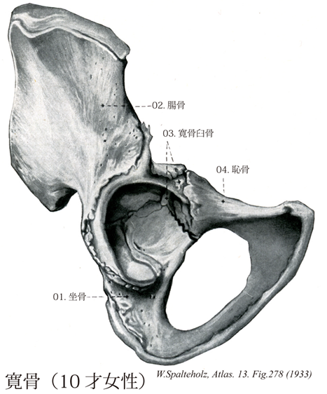 278_00【Hip bone; Coxal bone; Pelvic bone寛骨 Os coxae】 Bony structure comprising the ilium, ischium, and pubis. →(骨盤の前および側壁をなす厚い板状の大きな扁平骨で、腸骨、坐骨、恥骨からなる。中央部がくびれ、上方と下方に扇状に拡がった形をなし、全体の形は8の字に似ている。内面の後上方から前下方に走る隆起が腸骨弓状線で、この弓状線を境にして寛骨の上半部の前方が外側へ開くようにねじれた形をしている。中央部の外側面には杯よりやや大きい半球状の深い陥凹が寛骨臼である。寛骨臼の関節面は半月の形に似ているので月状面ともよばれ大腿骨頭を入れる関節窩で前下外側へ向く。寛骨臼縁は1平面上にはなく、下方で欠如する部分が寛骨臼切痕である。寛骨臼底部の円形の粗面が寛骨臼窩で、寛骨臼窩の外側の、丈夫が広い馬蹄形の平滑な関節面が月状面である。寛骨臼の前下方にある大きな卵形または三角形の空隙が閉鎖孔である。閉鎖孔の上縁を上方(内面)から下方(外面)へ走る溝が閉鎖溝である。恥骨の前閉鎖結節および坐骨の後閉鎖結節を結んだ線より下方の閉鎖孔は、生体では線維性の閉鎖膜によって閉鎖される。寛骨臼の上方で扇に拡がった部分が腸骨翼で、腸骨翼の上縁が腸骨稜である。寛骨は腸骨、坐骨、恥骨の三つの骨で構成される。若年者では軟骨結合により結合しているが、成人では骨結合により癒合している。寛骨臼の上部の板状に拡がった部分が腸骨、寛骨臼の下部(2/5強)および寛骨臼より下方と後方部が坐骨、寛骨臼の前部(1/5)および寛骨臼より前下方部が恥骨である。ラテン語のCoxa(臀)に由来する。やや古い英米の解剖学書では寛骨をinnominate bone(無名骨)と呼んでいる。この骨はA.C. CelsusがA.D.30年ころにos coxaeと命名しているにもかかわらず、Galenos(131-201 A.D.)は無責任にも「名なしの骨」と記載した。Vesalius (1514-1564)もこの呼び名を流用してos innominatumとしたのが、現在でも英語の中に生きているのである。)