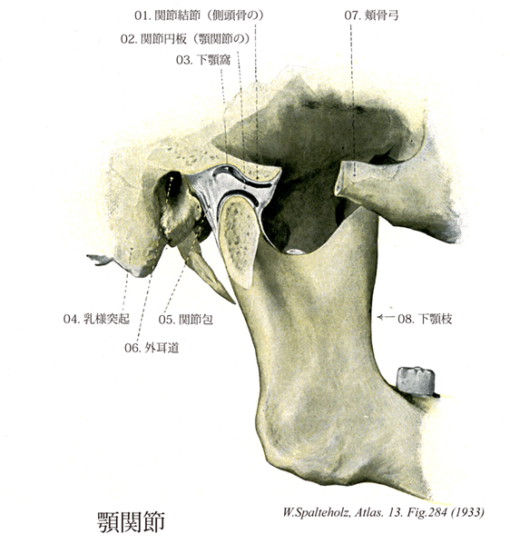 284_02【Articular disc of temporomandibular joint関節円板(顎関節の) Discus articularis temporomandibularis; Discus articulationis temporomandibularis】 Biconcave disc composed of layers of tough fibrous tissue and fibrocartilage located between the head of the mandible and the mandibular fossa. It is attached around its periphery to the joint capsule, dividing the joint into two cavities, and together they form the disco-capsular system, a single functional unit. →(関節円板は下顎頭のための可動性関節臼の役割を果たしている。この関節円板は前部では散在性の軟骨細胞を含む線維軟骨から成っている。その後部は2層性を示す。下顎窩の後壁に固着する上層は弾性線維を含む粗線線維性結合組織から成るが、下顎頭の後壁に付着している下層は非常に丈夫な密線線維結合組織からなるが、下顎頭の後壁に付着している下層は非常に丈夫な密線線維結合組織からなっている。前方で関節円板は関節包ならびに外側翼突筋と強固に結びついている。一般的には関節円板または関節半月は膠原線維の多い線維軟骨性の結合組織から成っている。円板は関節腔を完全に、半月はそれを不完全に分けている。円板および半月は誘導機能をもち、関節面の接触を良くし、場合によっては、顎関節または胸鎖関節などに見られるように、完全に分かれた2つの関節腔をつくりだすことさえある。このような関節円板は疾患時に、あるいは摘出されても新生が起こりうる。)