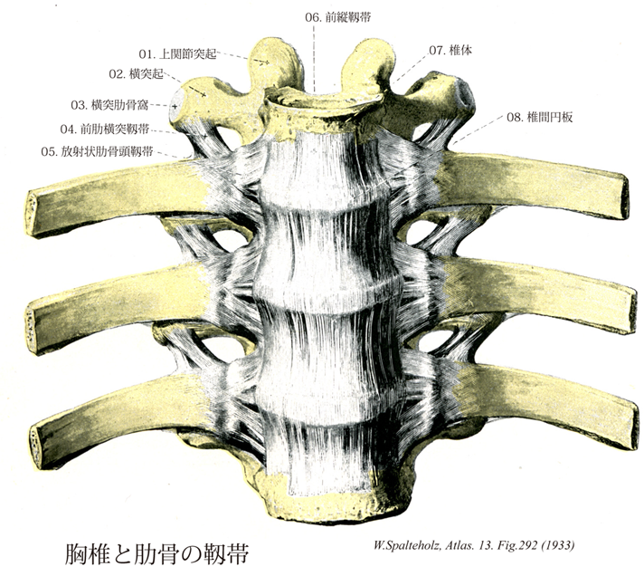 292_05【Radiate ligament of head of rib放射状肋骨頭靱帯 Ligamentum capitis costae radiatum】 Ligament that reinforces the anterior surface of the joint capsule. It radiates from the rib in a stellate fashion over the head of the rib to the two adjacent vertebral bodies and the intervertebral disc between them. →(肋骨頭関節の関節包は薄いがあまり余裕がなく、下面の線維がいくらか長いだけである。前面は厚く、肋骨頭から放射して上下の錐体と椎間円板に向かう線維は放射状肋骨頭靱帯をつくる。)