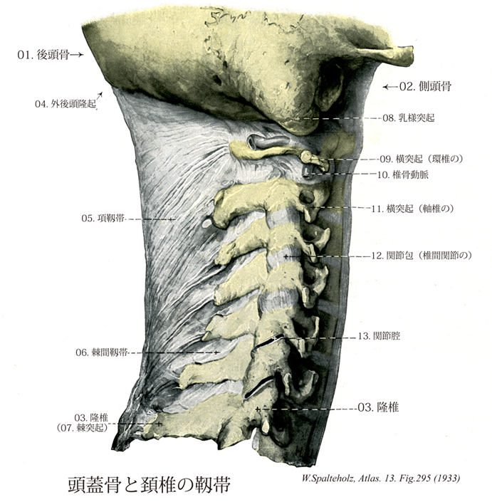 295_05【Ligamentum nuchae; Nuchal ligament; Nuchal septum項靱帯;項中隔 Ligamentum nuchae; Septum nuchae; Septum medianum nuchae】 Sagittally widened continuation of the supraspinous ligament that extends from C7 to the external occipital protuberance. In humans it has little elasticity. →(後頭骨の外側頭隆起と外後頭稜から第7頚椎棘突起の間にはる線維性膜で、深部では頚椎の棘突起につく。左右の頚部固有背筋を隔てる中隔を形成する。第7頚椎以下の棘上靱帯に相当する。膠原線維のほか弾性線維を含むが、後者の含有はヒトでは少ない。)