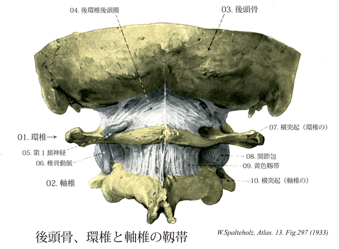 297_04【Posterior atlanto-occipital membrane後環椎後頭膜 Membrana atlantooccipitalis posterior; Membrana atlantooccipitalis dorsalis】 Membrane in the posterior wall of the vertebral canal that extends from the posterior arch of the atlas to the occipital bone. →(後環椎後頭膜は黄色靱帯のつづきとみなされるもので、環椎後弓と大後頭孔後縁の間に張り、弾性線維に富む。その外側端の環椎後頭関節包に近い所で、椎骨動脈および第1頚神経を通す孔を環椎後弓との間につくる。同じく黄色靱帯のつづきで環椎後頭弓との間にある部は、後環軸膜(JNA)の名もある。)