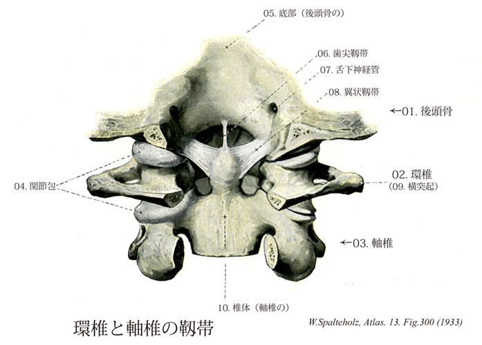→(翼状靱帯は歯突起の上部の側面から起こる強い、厚い帯状の靱帯で、上外方に向かって後頭顆の内面に着く。頭関節における頭の過度の回旋を制限する。頭の回旋は頭を前屈した状態ではその範囲が狭く、後屈した状態では広い。これは前屈のみによっても翼状靱帯が緊張することがその理由の一つであると考えられている。)