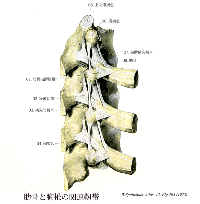 305_02【Posterior longitudinal ligament後縦靱帯;後総縦靱帯 Ligamentum longitudinale posterius; Ligarnentum longitudinale commune dorsale】 Ligament that mainly connects the intervertebral discs, traveling along the posterior surfaces of the vertebral bodies within the anterior wall of the vertebral canal. It is continuous with the tectorial membrane from the third cervical vertebra upward. →(後縦靱帯は椎体と椎間円板の後面に沿い、脊柱管の前壁を縦走する。上端は幅が広く、大後頭孔前縁より約1cm上方の斜台から起こり(この部の深層の部は蓋膜と呼ばれる)、下方ほど狭くなって仙骨管の前壁に達する。椎間円板およびそれに接する椎体の縁と固く結合し、椎体後面の中部とは結合がゆるい。とくにひゅそうの線維は4~5個の椎体を越えて椎間円板から椎間円板へと結合し、この靱帯が椎間円板に着くところでは特に幅が広くなっている。前・後縦靱帯は椎体と椎間円板からなる柱を前後から支えるとともに、椎間円板の弾性によって緊張させられている。)