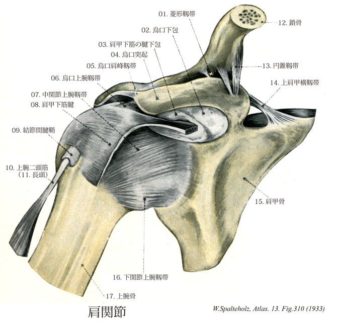 →(肩関節は肩甲骨関節窩と上腕骨頭との間の典型的な球関節。関節窩は小さく、関節頭としての上腕骨頭の関節面の約1/3の広さにすぎない。関節窩の周縁は、線維軟骨性の関節唇によって補われる。関節包の外側にはこれを補強するとくに強い靱帯がないから、両者の結合はゆるく、関節の自由な運動を可能にする。補強靱帯の代わりをするのは、肩甲骨から起始して上腕骨近位部に停止する肩甲筋群である。関節包は、上方には関節窩の周縁につき、ここで関節唇の外側と癒着し、下方には上腕骨の解剖頚につく。また内側は関節の下方でゆるみがあるから、これが上肢の回転を可能にするが、同時に下方への脱臼をおこしやすい原因となる。関節腔内は上腕二頭筋長頭の腱によって貫かれる。この腱は下方から上腕骨の結節間溝を通って関節腔に入り、上腕骨頭の前面を通って肩甲骨の関節上結節につく。全身の関節のうち最も大きい運動範囲をもち、その運動は屈曲(前方挙上)、伸展(後方挙上)、内転、外転、描円および回旋に分析鎖される。これらの運動は上肢帯の関節(胸鎖関節と肩鎖関節)との共同運動により範囲が増大される。肩甲骨関節窩は、前頭面(左右方向)に向いているのではなく、これより前外方に約30°の角をなす面にあるから(この面を肩甲骨面という)、肩関節の運動もこの面において最も運動範囲が広い。日常、物を書くときや、箸を取るときの上腕骨の位置にもこの面にある。これに属する靱帯として次のものがある。関節上腕靱帯は、関節唇の上前縁よりおこり解剖頚へつく。烏口上腕靱帯は、烏口突起の外側面よりおこり、上腕骨結節間溝の近位端にのび、ここで上腕二頭筋長頭の腱をおおう。 )