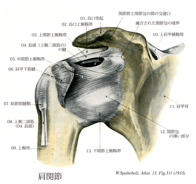 311_00【Glenohumeral joint; Shoulder joint肩関節;関節窩上腕関節 Articulatio humeri; Articulatio glenohumeralis】 Shoulder joint between the scapula and the humerus. →(肩関節は肩甲骨関節窩と上腕骨頭との間の典型的な球関節。関節窩は小さく、関節頭としての上腕骨頭の関節面の約1/3の広さにすぎない。関節窩の周縁は、線維軟骨性の関節唇によって補われる。関節包の外側にはこれを補強するとくに強い靱帯がないから、両者の結合はゆるく、関節の自由な運動を可能にする。補強靱帯の代わりをするのは、肩甲骨から起始して上腕骨近位部に停止する肩甲筋群である。関節包は、上方には関節窩の周縁につき、ここで関節唇の外側と癒着し、下方には上腕骨の解剖頚につく。また内側は関節の下方でゆるみがあるから、これが上肢の回転を可能にするが、同時に下方への脱臼をおこしやすい原因となる。関節腔内は上腕二頭筋長頭の腱によって貫かれる。この腱は下方から上腕骨の結節間溝を通って関節腔に入り、上腕骨頭の前面を通って肩甲骨の関節上結節につく。全身の関節のうち最も大きい運動範囲をもち、その運動は屈曲(前方挙上)、伸展(後方挙上)、内転、外転、描円および回旋に分析鎖される。これらの運動は上肢帯の関節(胸鎖関節と肩鎖関節)との共同運動により範囲が増大される。肩甲骨関節窩は、前頭面(左右方向)に向いているのではなく、これより前外方に約30°の角をなす面にあるから(この面を肩甲骨面という)、肩関節の運動もこの面において最も運動範囲が広い。日常、物を書くときや、箸を取るときの上腕骨の位置にもこの面にある。これに属する靱帯として次のものがある。関節上腕靱帯は、関節唇の上前縁よりおこり解剖頚へつく。烏口上腕靱帯は、烏口突起の外側面よりおこり、上腕骨結節間溝の近位端にのび、ここで上腕二頭筋長頭の腱をおおう。 )